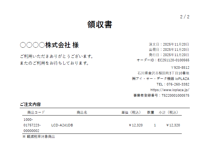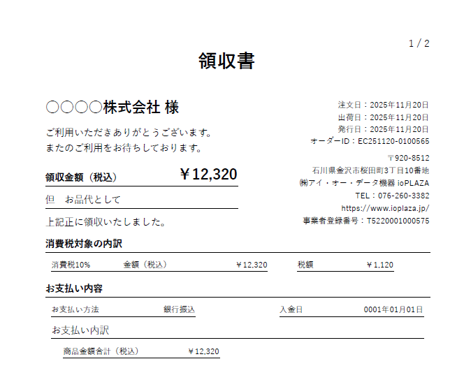※領収書のフォーマットに不都合がある場合は、別途お問い合わせください。