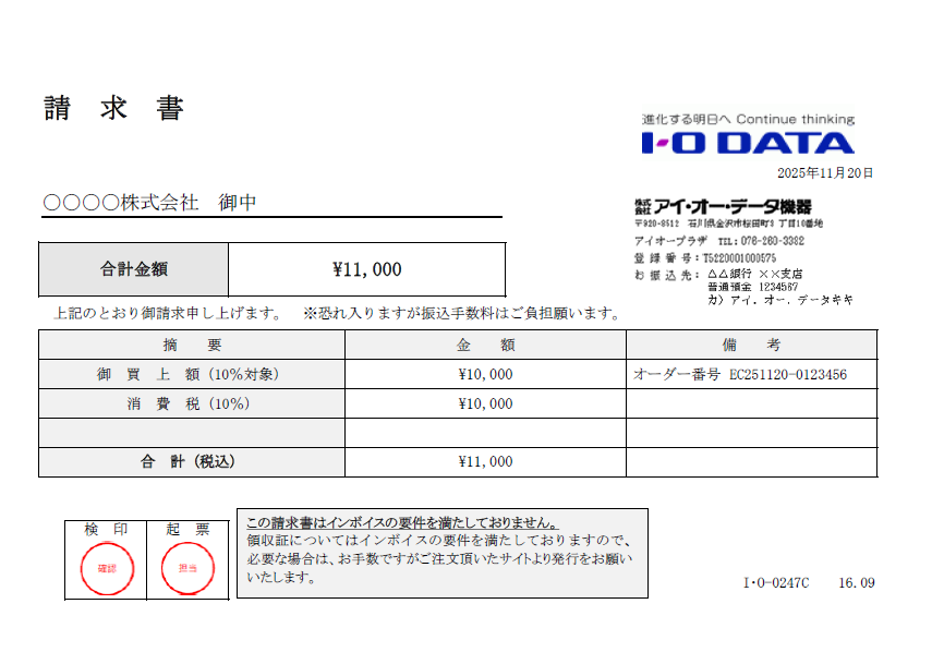 当店では商品出荷後、マイページにてインボイス対応の領収書を発行することが可能です。